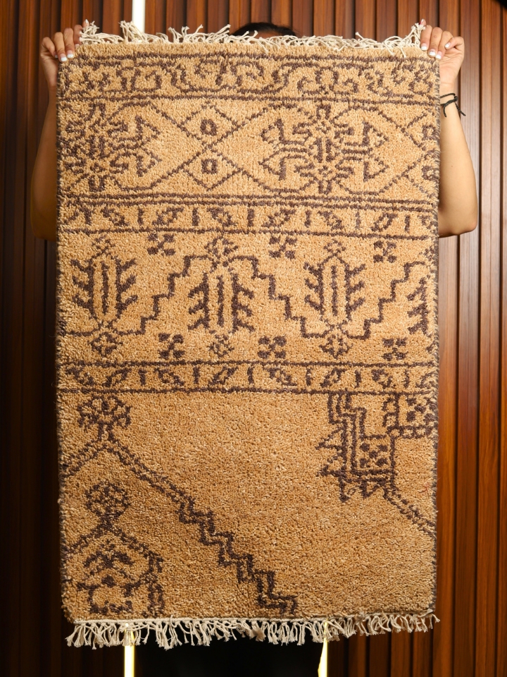 A rustic, hand-knotted rug featuring traditional Moroccan Berber-style geometric patterns in dark brown on a natural tan background, with fringed edges, perfect for adding warmth and texture.
