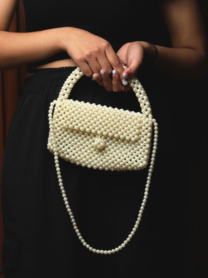 Its versatile design comes with a top handle and a long pearl sling strap, allowing you to carry it as a clutch, handbag, or shoulder bag. Compact yet functional, it's ideal for carrying your phone, cards, lipstick, and other small essentials.
