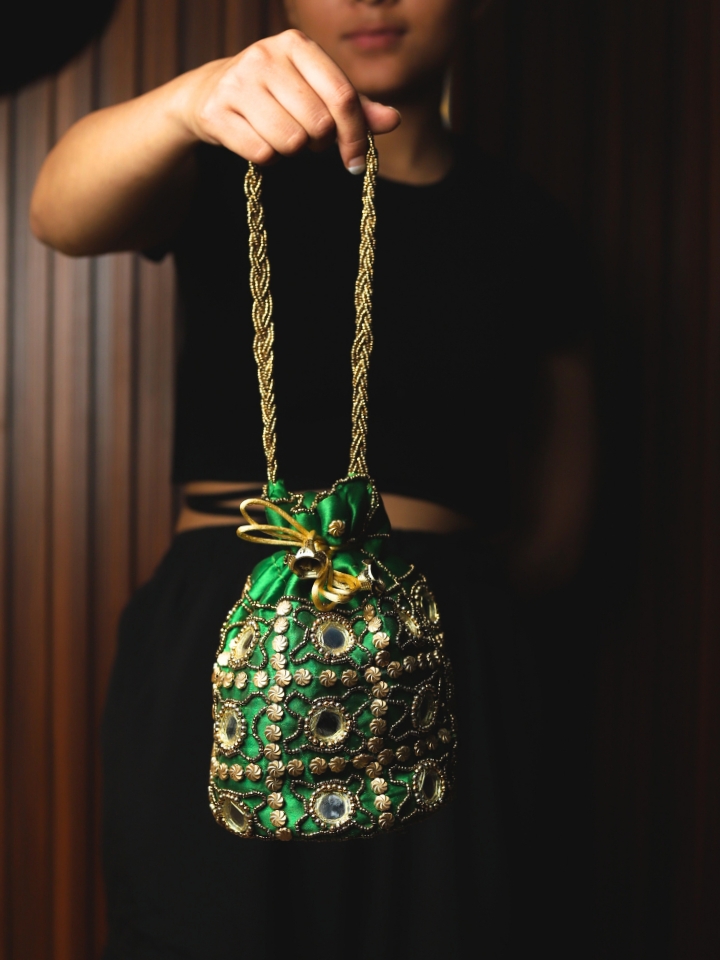 Add a regal touch to your ethnic ensemble with our Royal Green Embroidered Potli Bag – a perfect blend of traditional charm and modern elegance. Made from premium satin silk fabric, this handcrafted potli features intricate zari embroidery, mirror work, golden beads, and a stunning drawstring closure with bells, making it a statement piece for weddings, parties, and festive occasions.