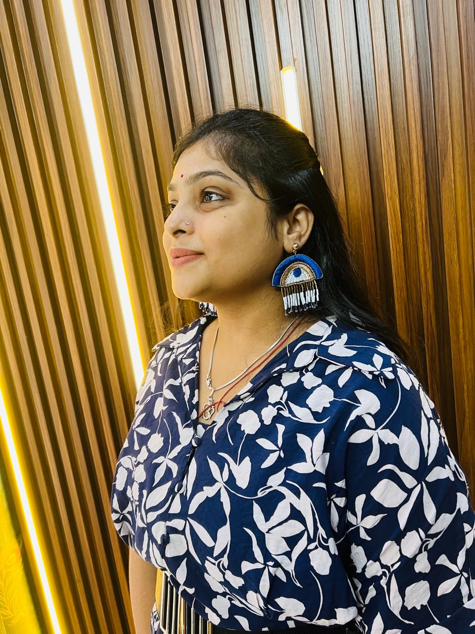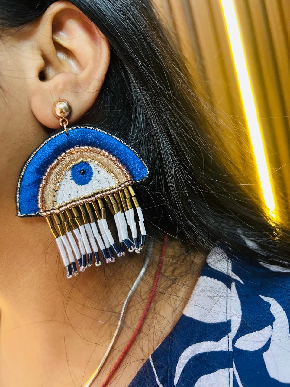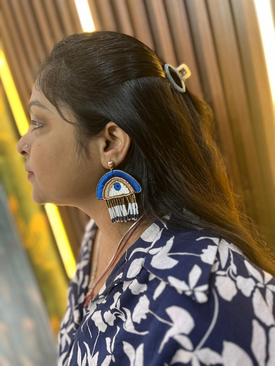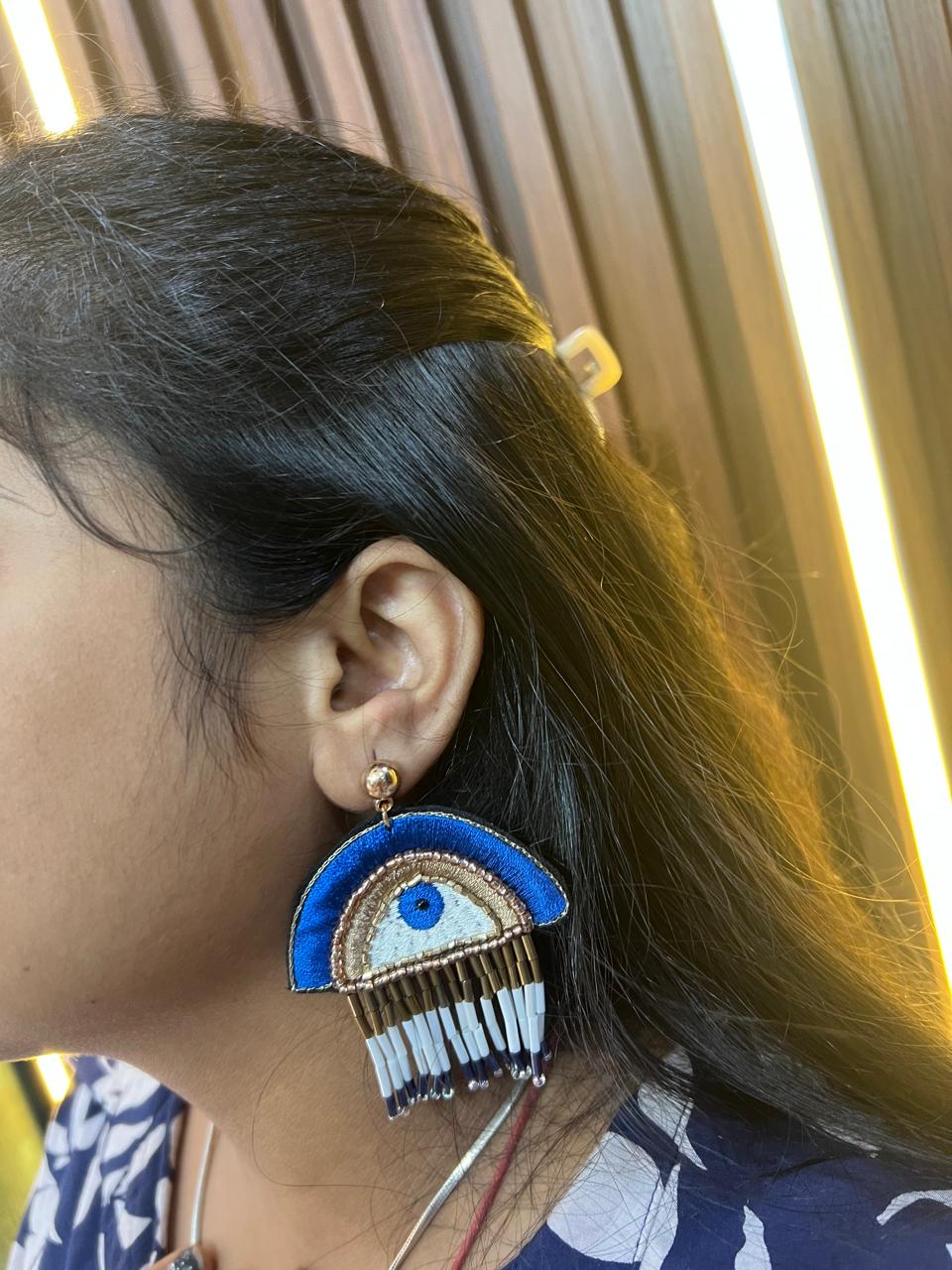 | Add a touch of bold elegance with these handcrafted Blue Evil Eye Beaded Statement Earrings. Featuring an intricate evil eye motif embroidered with vibrant blue, white, and gold threads, these earrings are accented with hanging bead tassels for a playful yet sophisticated look. Perfect for pairing with both casual and festive outfits, they not only elevate your style but also symbolize protection and positive energy. Lightweight and comfortable for all-day wear. |