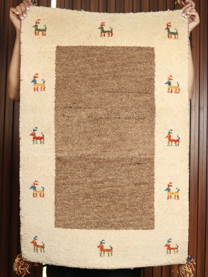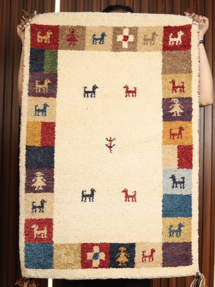 A handcrafted area rug with a cream background, featuring playful multi-colored block patterns and animal motifs around the border, with charming animal figures scattered in the center.