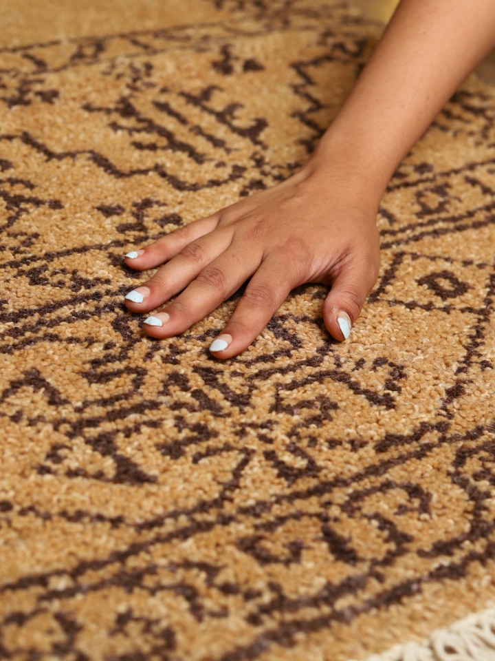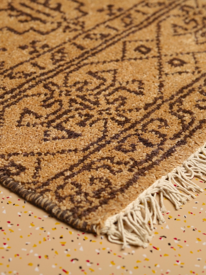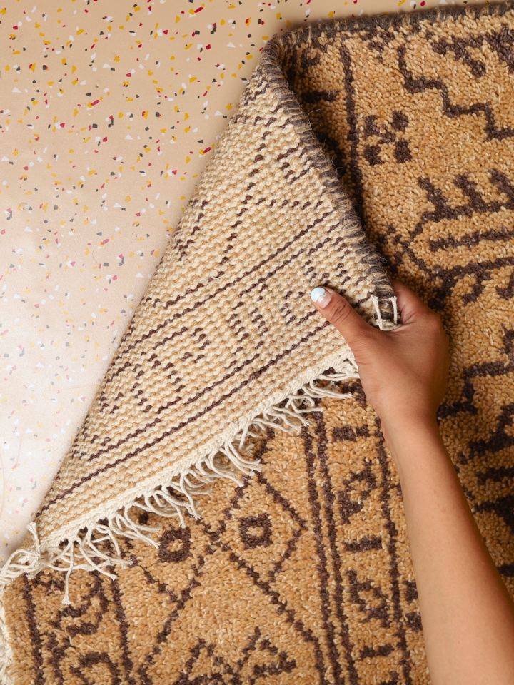 A rustic, hand-knotted rug featuring traditional Moroccan Berber-style geometric patterns in dark brown on a natural tan background, with fringed edges, perfect for adding warmth and texture.