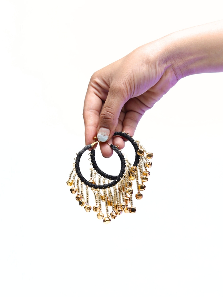 A bold blend of tradition and trend—black-threaded hoops adorned with golden ghungroos for that perfect festive flair. Lightweight, statement-worthy, and irresistibly desi-chic.