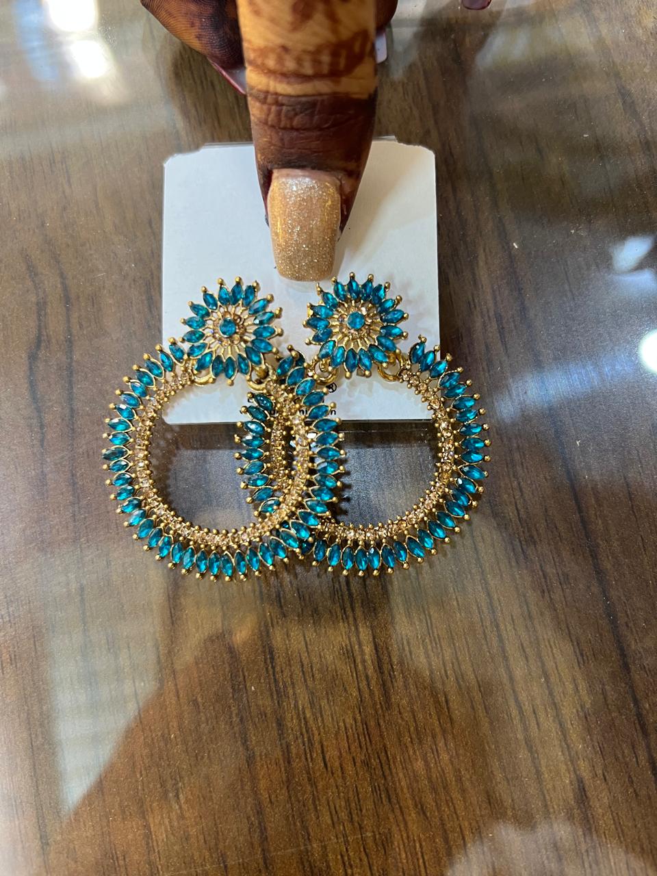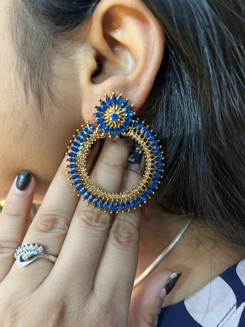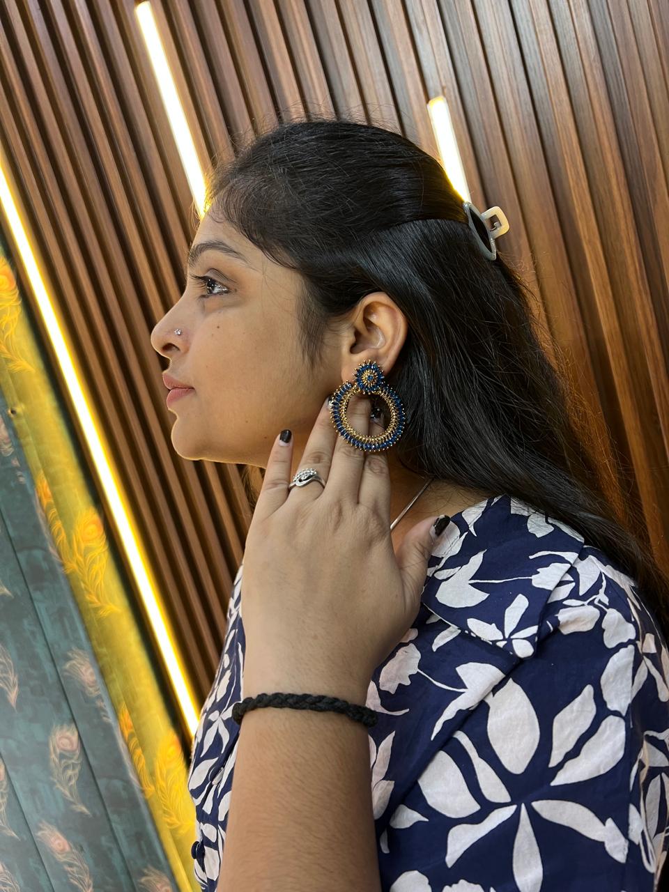 Add a regal touch to your look with these Royal Blue & Gold Beaded Hoop Earrings. Expertly handcrafted, they feature intricate golden wire detailing adorned with radiant blue beads arranged in a floral-inspired circular design. Perfect for festive occasions or elegant evenings, these earrings blend traditional artistry with modern sophistication. Lightweight and eye-catching, they’re a must-have accessory for anyone who loves statement jewelry with a touch of glamour.
