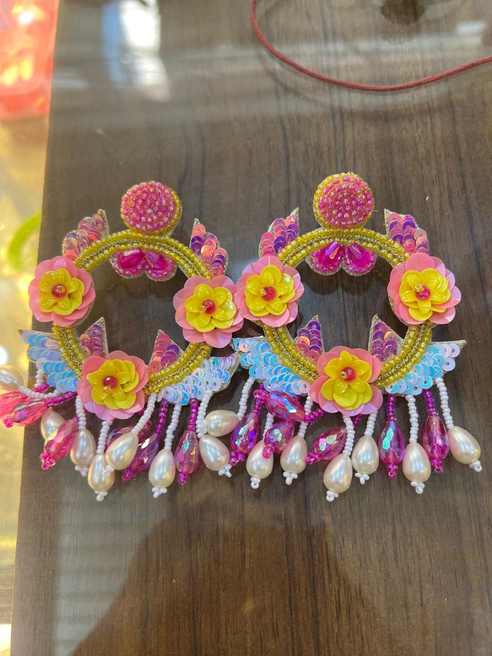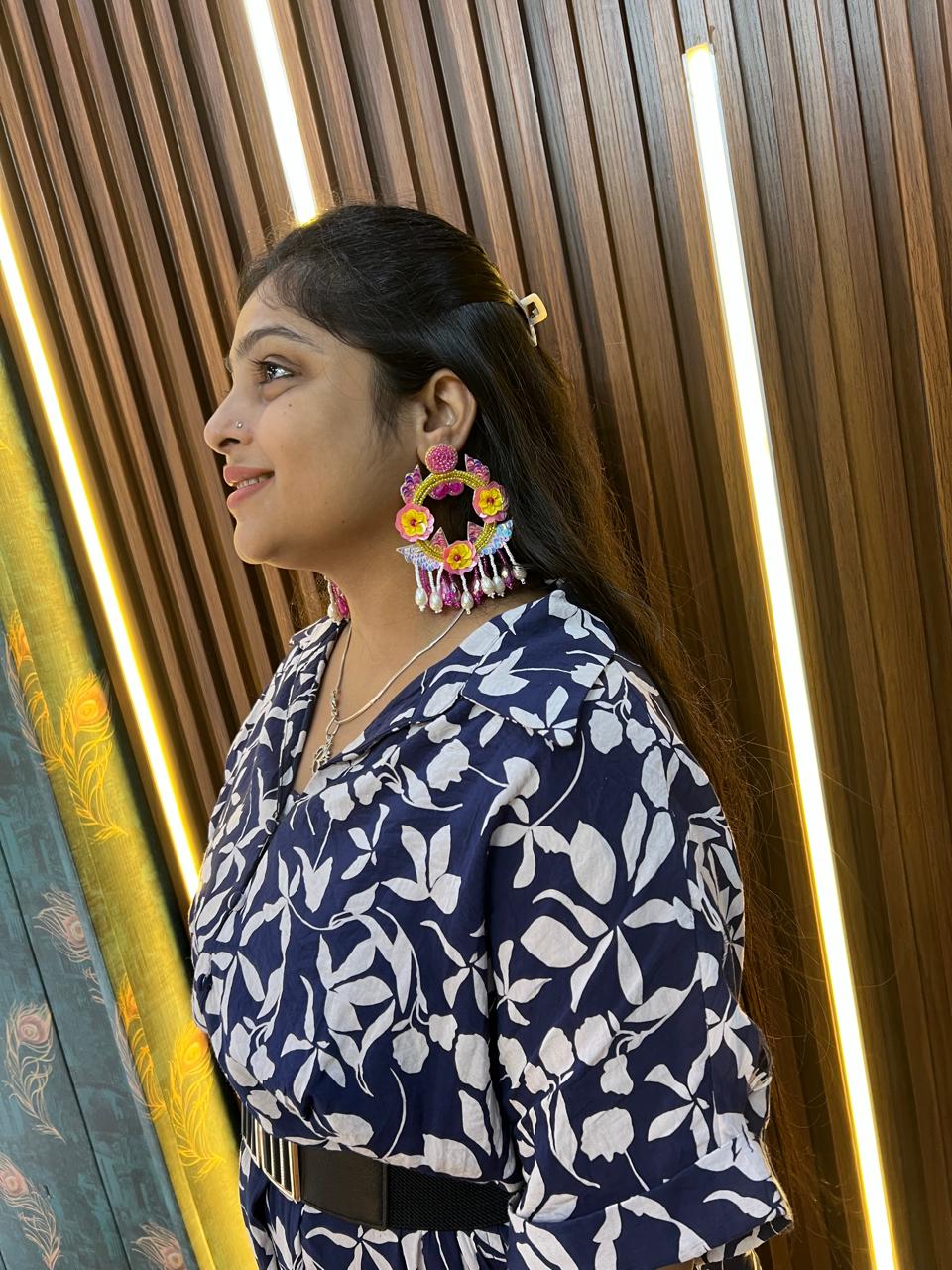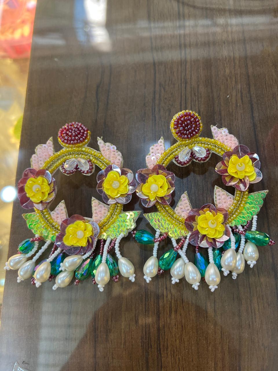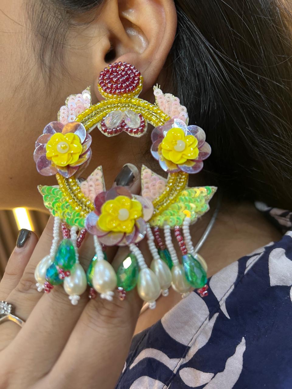 Bring a burst of color to your style with these Vibrant Floral Hoop Beaded Earrings. Beautifully handcrafted with pink and yellow floral embellishments, shimmering sequins, and pearl drop accents, these earrings exude a playful yet elegant charm. The circular beaded frame adds a festive touch, making them perfect for